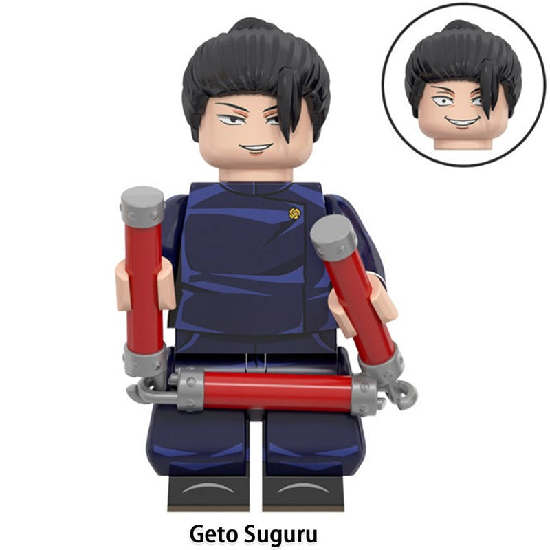 This Jujutsu Kaisen minifigure set includes Maki Zenin, Toge Inumaki, Suguru Geto, Rika Orimoto, Yuta Okkotsu, Satoru Gojo and more—LEGO-compatible custom brick figures crafted for collectors and themed builds.